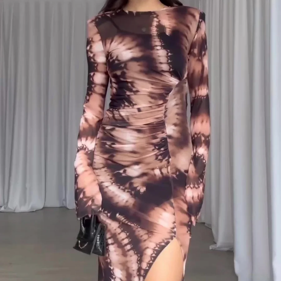 فستان بقصة ضيقة وفتحة جانبية جذابة مزين بنقشة عصرية