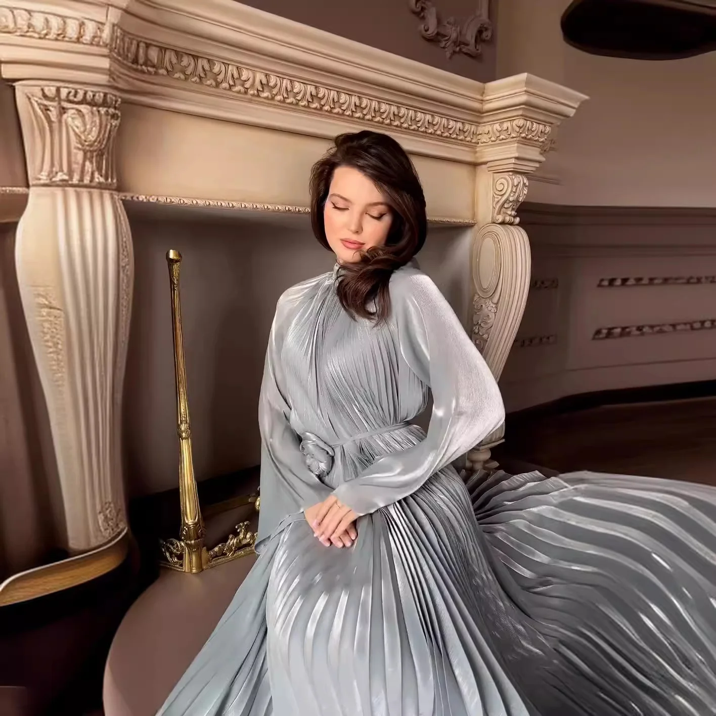 فستان حريري رمادي فاخر إيطالي عالي الجودة